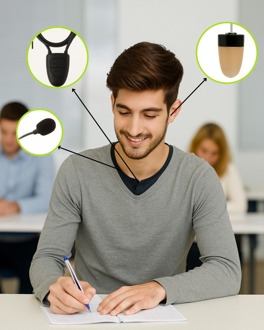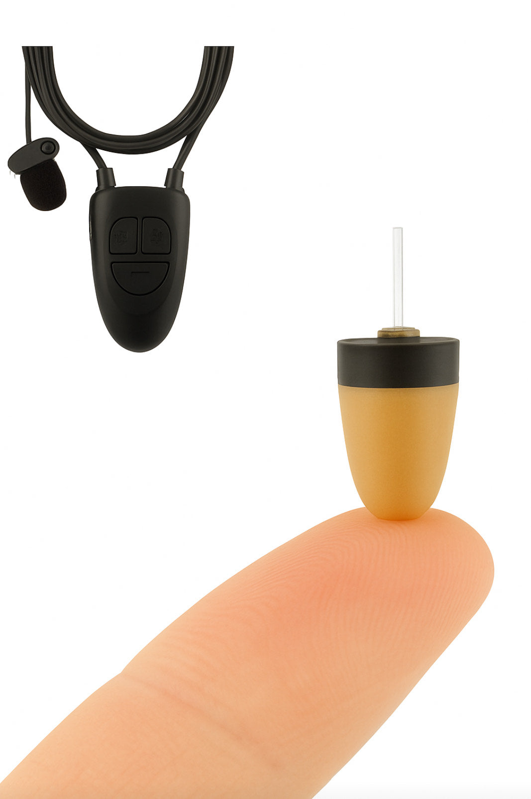 Pinganillo con conexión Bluetooth y micrófono integrado. Totalmente oculto, permite llamadas y control desde el collar.
